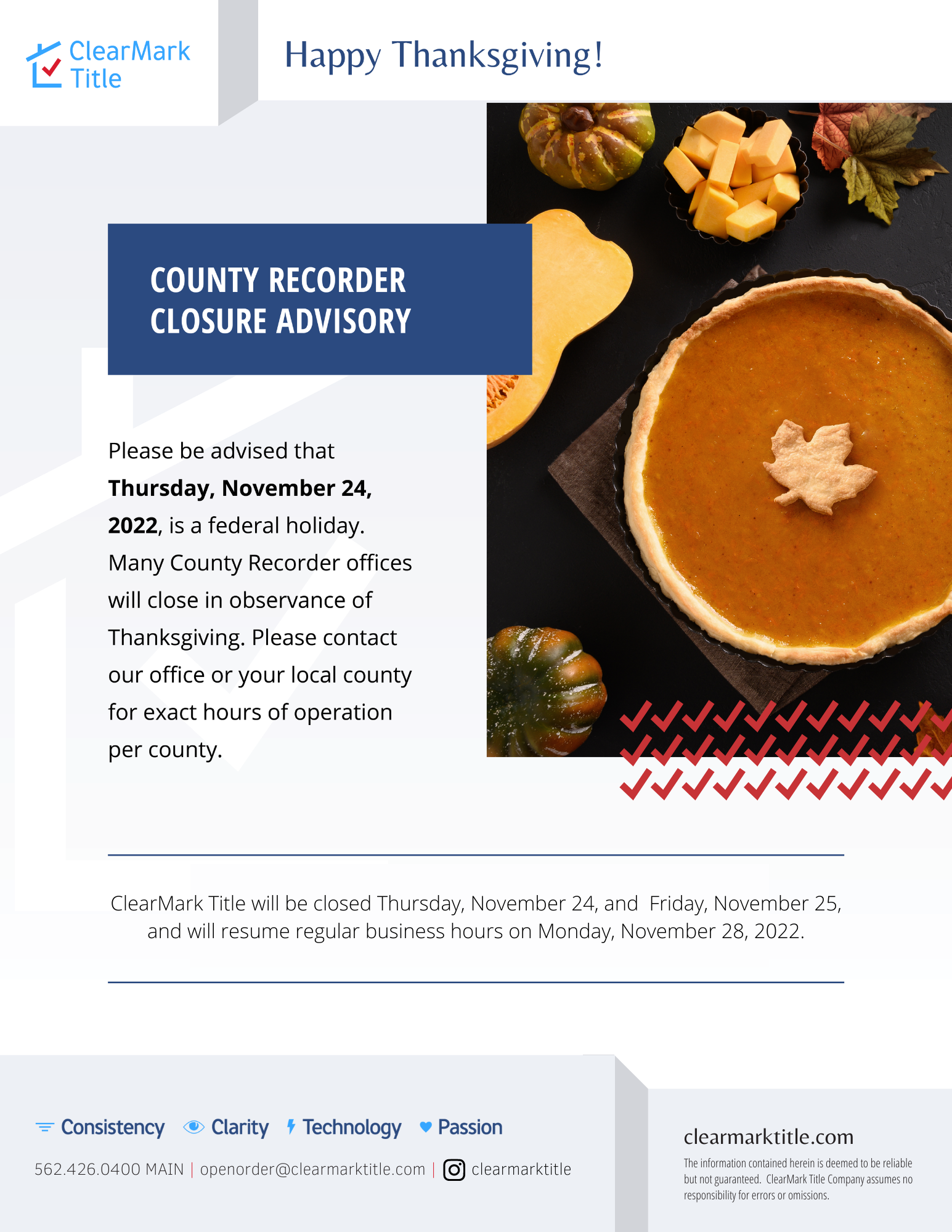 In observance of Thanksgiving, ClearMark Title will be closed Thursday and Friday, November 24 and 25. All County Recording offices will also be closed. We wish you and yours a safe and Happy Thanksgiving. We are grateful for your business and continued trust in our team.